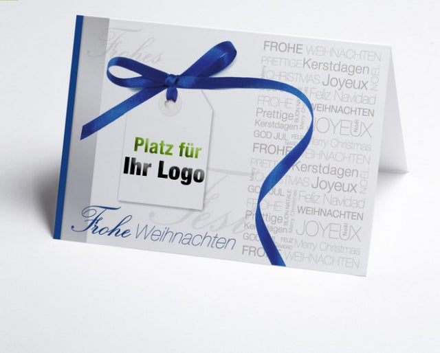 Die geschäftlichen Weihnachtskarten im eleganten Weiß-Blau-Design sind die perfekte Wahl, um professionelle und zugleich festliche Grüße zu versenden. Das Motiv mit einer stilvollen Schleife und internationalen Texten vermittelt Wertschätzung und ist ideal für Unternehmen mit weltweiten Kunden und Geschäftspartnern. Dein Firmenlogo wird prominent auf der Vorderseite platziert und macht die Karte zu einem exklusiven Markenbotschafter.