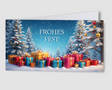 Die geschäftlichen Weihnachtskarten mit verschneiter Waldszene sind eine stimmungsvolle Möglichkeit, deine festlichen Grüße zu versenden. Das winterliche Motiv zeigt reich geschmückte Tannenbäume und zahlreiche bunt verpackte Geschenke im Vordergrund – ein Bild voller Freude, Wärme und festlicher Atmosphäre. Perfekt, um Kunden, Mitarbeitern und Geschäftspartnern „Frohe Weihnachten“ zu wünschen.