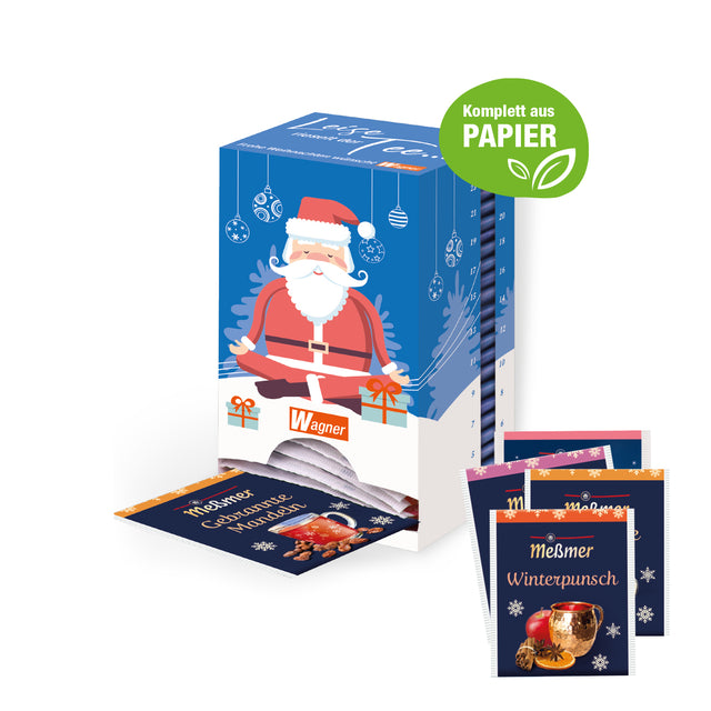 Der Adventskalender für Unternehmen von Meßmer ist die ideale Alternative zu klassischen Schokoladenkalendern. Gefüllt mit 24 einzeln verpackten Teebeuteln in winterlichen Sorten wie Winterpunsch, Zimt Pflaume oder Himmelszauber sorgt er Tag für Tag für Genussmomente voller Wärme und Gelassenheit.