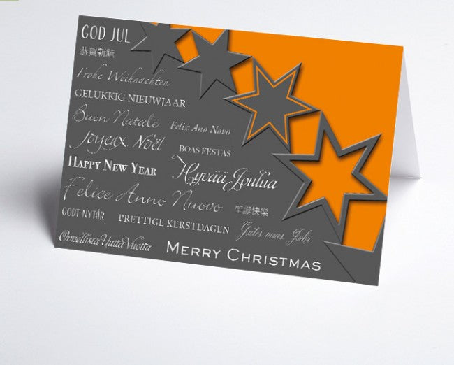 Die moderne Weihnachtskarte, bedruckbar mit deinem Logo, begeistert durch ihr stilvolles Sternen-Design und einen internationalen Grußtext. Als exklusive Doppelkarte überzeugt sie mit hochwertigem Druck auf Vorder- und Rückseite, einem farbigen Inneneindruck und einem naturweißen Kuvert – perfekt, um deine Weihnachtsgrüße professionell zu übermitteln.