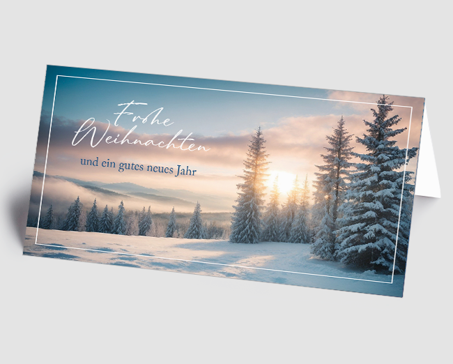 Die Weihnachtskarten an Kunden mit verschneiter Winterlandschaft im Sonnenaufgang sind eine stimmungsvolle Wahl, um festliche Grüße zu versenden. Der harmonisch integrierte Schriftzug „Frohe Weihnachten und ein gutes neues Jahr“ vermittelt Wärme, Ruhe und Besinnlichkeit – perfekt, um deine Kunden und Geschäftspartner mit stilvollen Weihnachts- und Neujahrswünschen zu überraschen.