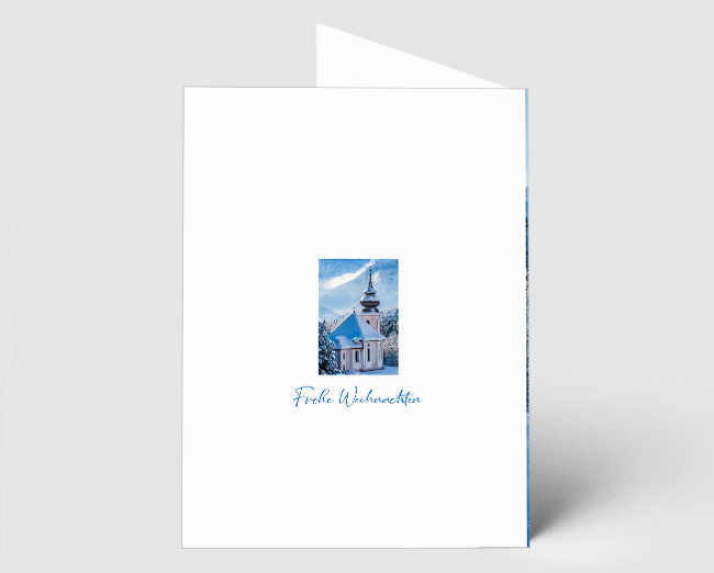 Die Weihnachtskarten für Kunden mit idyllischem Wintermotiv sind eine besonders stimmungsvolle Wahl für festliche Grüße. Das Motiv zeigt eine verschneite Kapelle inmitten einer ruhigen Winterlandschaft, umgeben von majestätischen Bergen. Der Schriftzug „Frohe Weihnachten und ein gutes neues Jahr“ ziert den oberen Rand der Karte und ergänzt die Szene mit einer feierlichen Botschaft – ideal, um Kunden und Geschäftspartnern deine Wertschätzung auszudrücken.