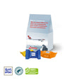 Mit zwei auswählbaren Füllungen lässt sich das Werbepräsent flexibel einsetzen. Ob klassische Schokowürfel oder feine Pralinés – beide Varianten stehen für bekannten Genuss und sorgen für einen angenehmen Moment nach dem Messebesuch.